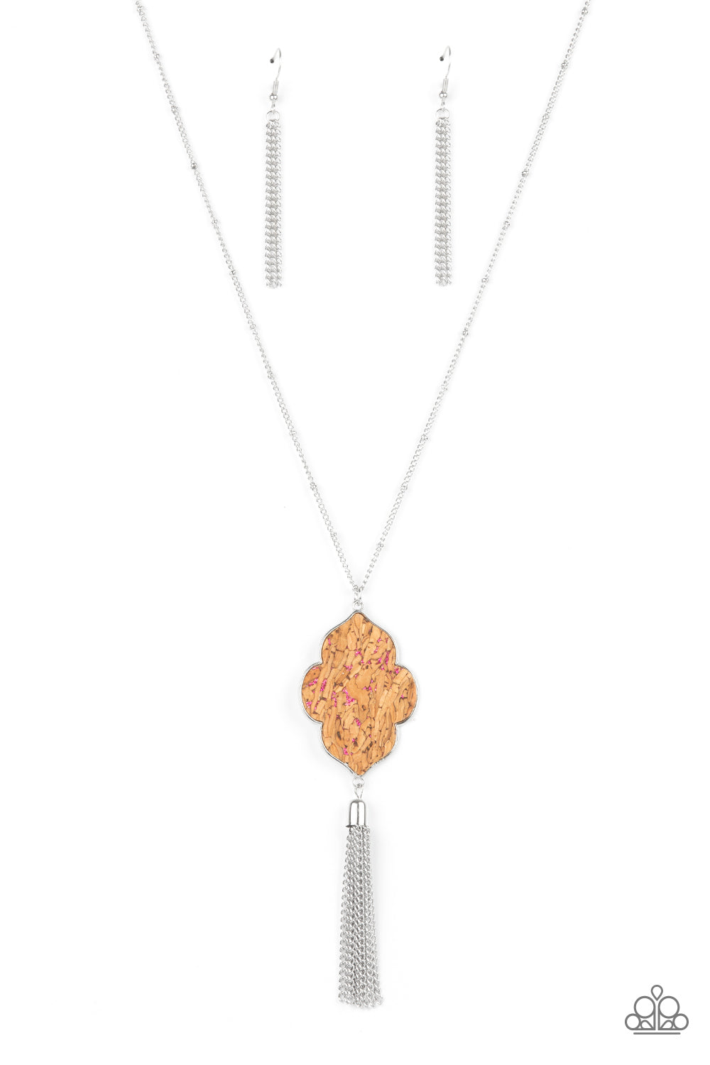 Flecked in glittery pink sparkles, a scalloped cork frame is pressed into a sleek silver frame at the bottom of a dainty silver satellite chain. A classic silver chain tassel swings from the whimsical pendant, adding flirtatious movement to the one-of-a-kind display. Features an adjustable clasp closure.