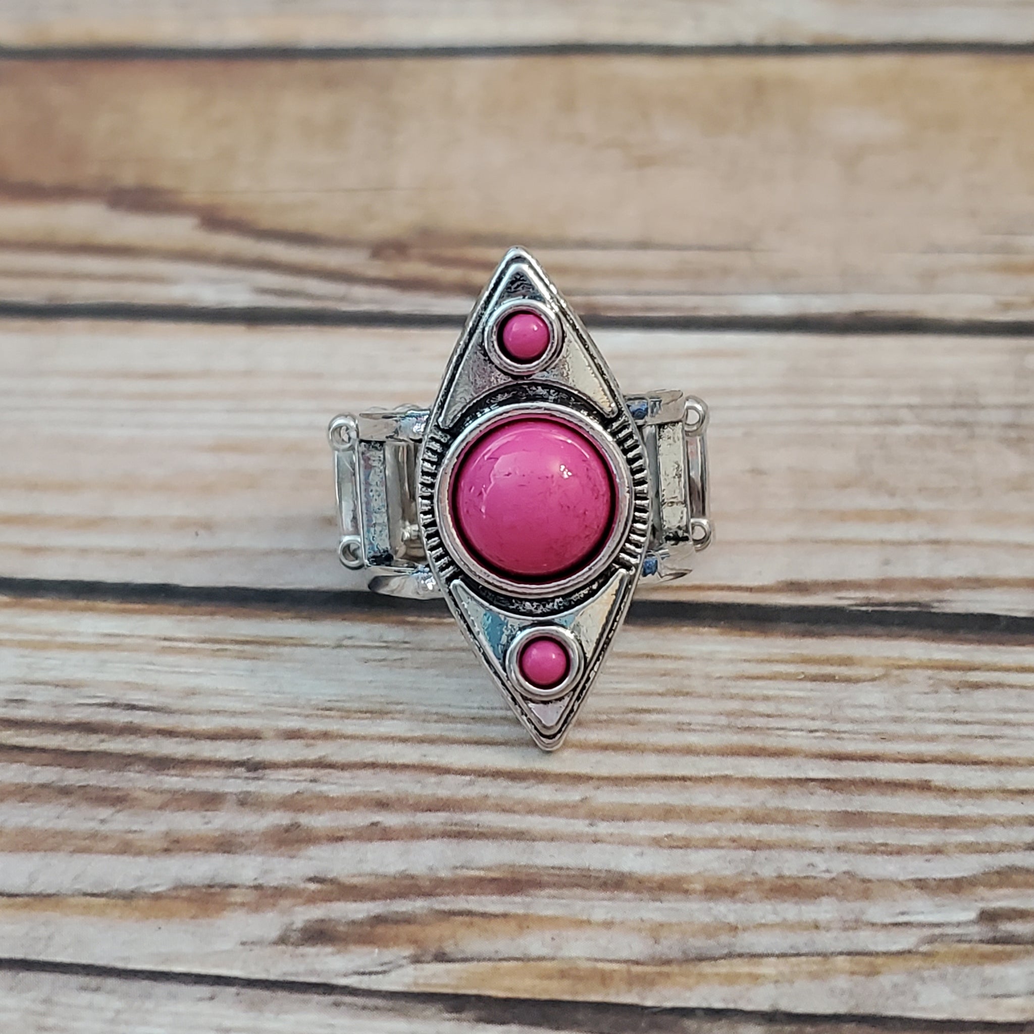 Three bubbly Fuchsia Fedora beads stack across the front of a textured silver oblong frame, resulting in a playful pop of color atop layered silver bands. Features a stretchy band for a flexible fit.