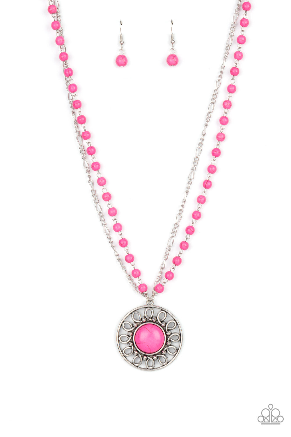 A dainty silver chain is paired with a pink stone beaded chain below the collar. An oversized pink stone adorns the center of an antiqued silver frame radiating with silver studded and wire-like detail, creating an authentic artisan inspired pendant at the bottom of the earthy chains. Features an adjustable clasp closure.