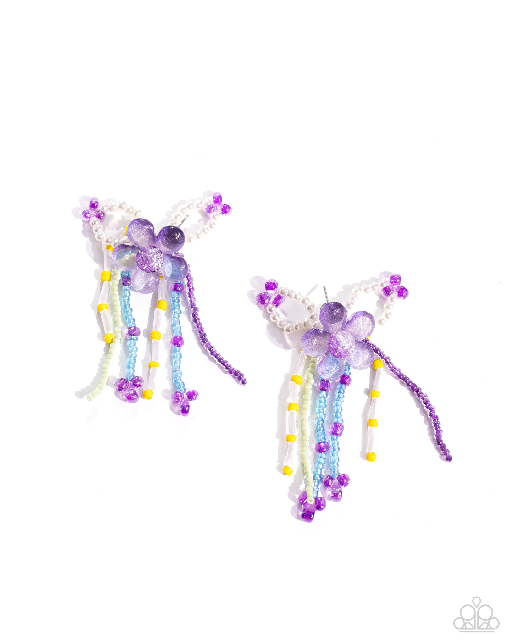 A frosted purple acrylic flower with a glassy purple center glistens from the ear. Strands of glassy and pearlized turquoise, yellow, mint, and purple seed beads and white pearls in round and cylindrical shapes flourish from the purple flower, mimicking whimsical vines. Earring attaches to a standard post fitting.
