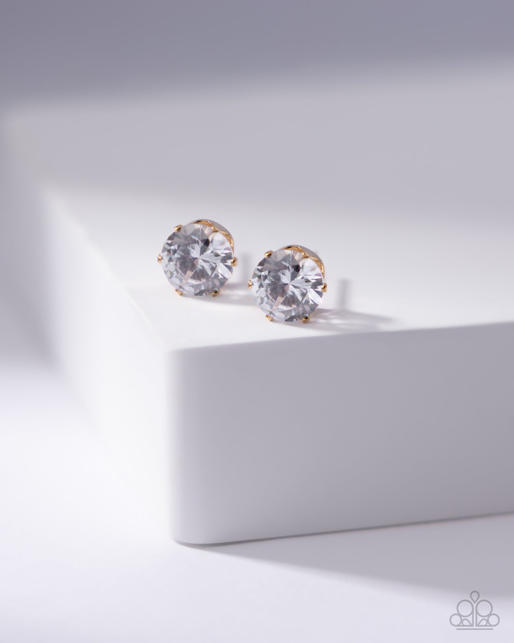 A sparkling white rhinestone is nestled inside a classic gold frame for a timeless look. Earring attaches to a standard post fitting.