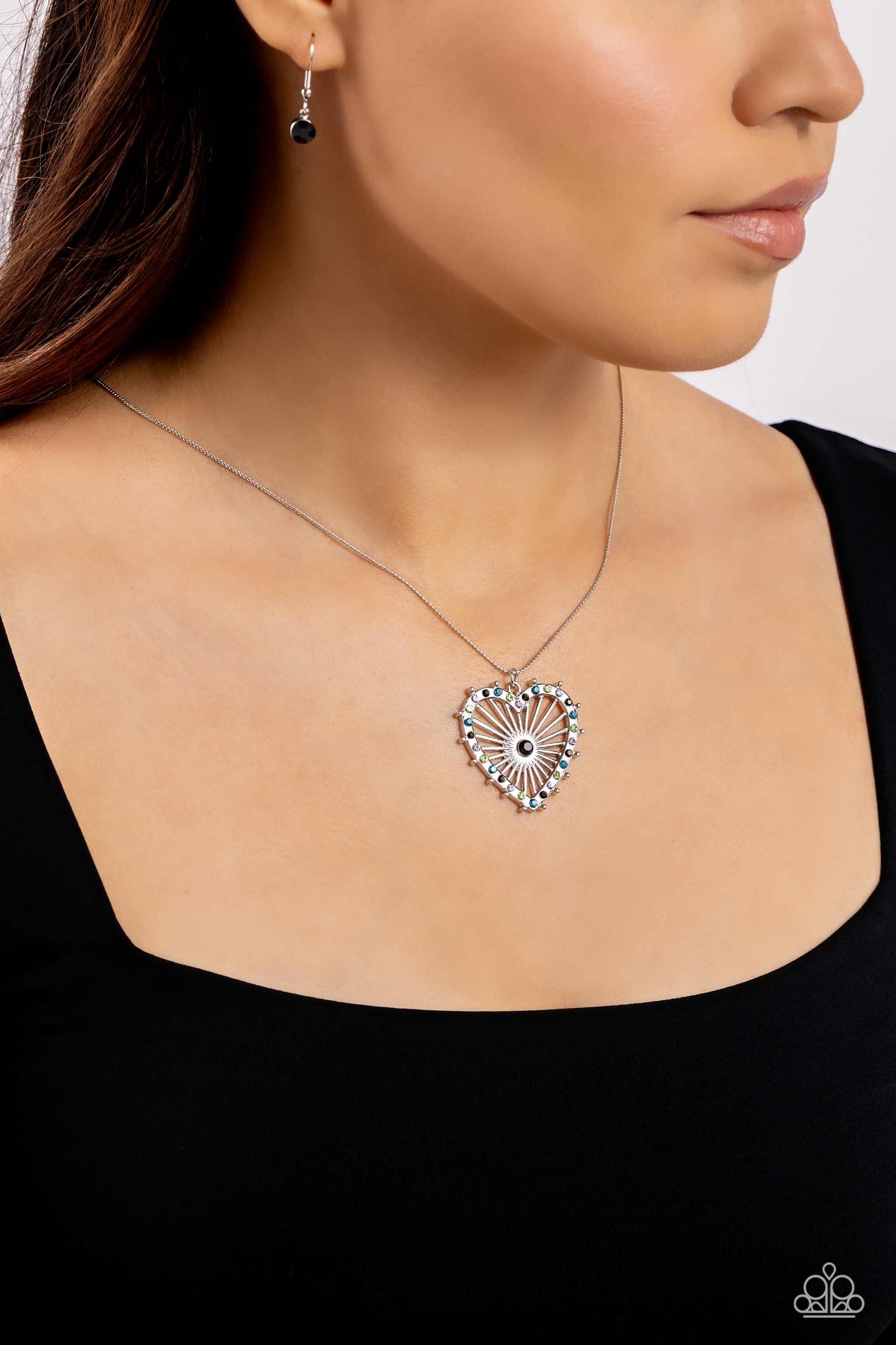 Dotted with glittery black, blue, green, and purple rhinestones, an oversized heart frame radiating with linear texture topped with a black rhinestone center swings from the bottom of a lengthened dainty silver chain for a carnival-inspired look. Features an adjustable clasp closure.