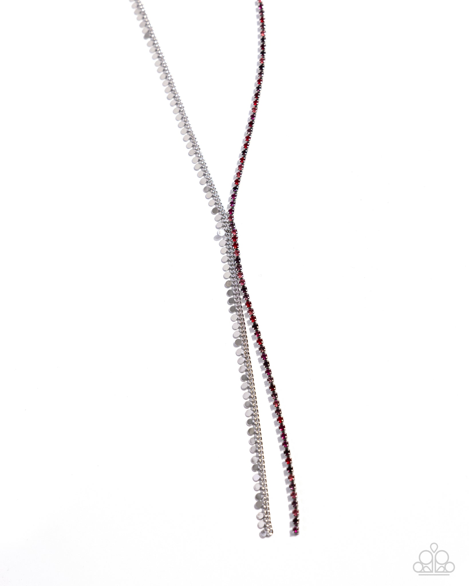 Cascading from a classic chain strand, dainty silver discs join a silver-pronged red and pink rhinestone strand as they shimmer and shine down the chest. The two individual strands meet together at about the center of the chest for a knockout finish. Features an adjustable clasp closure.