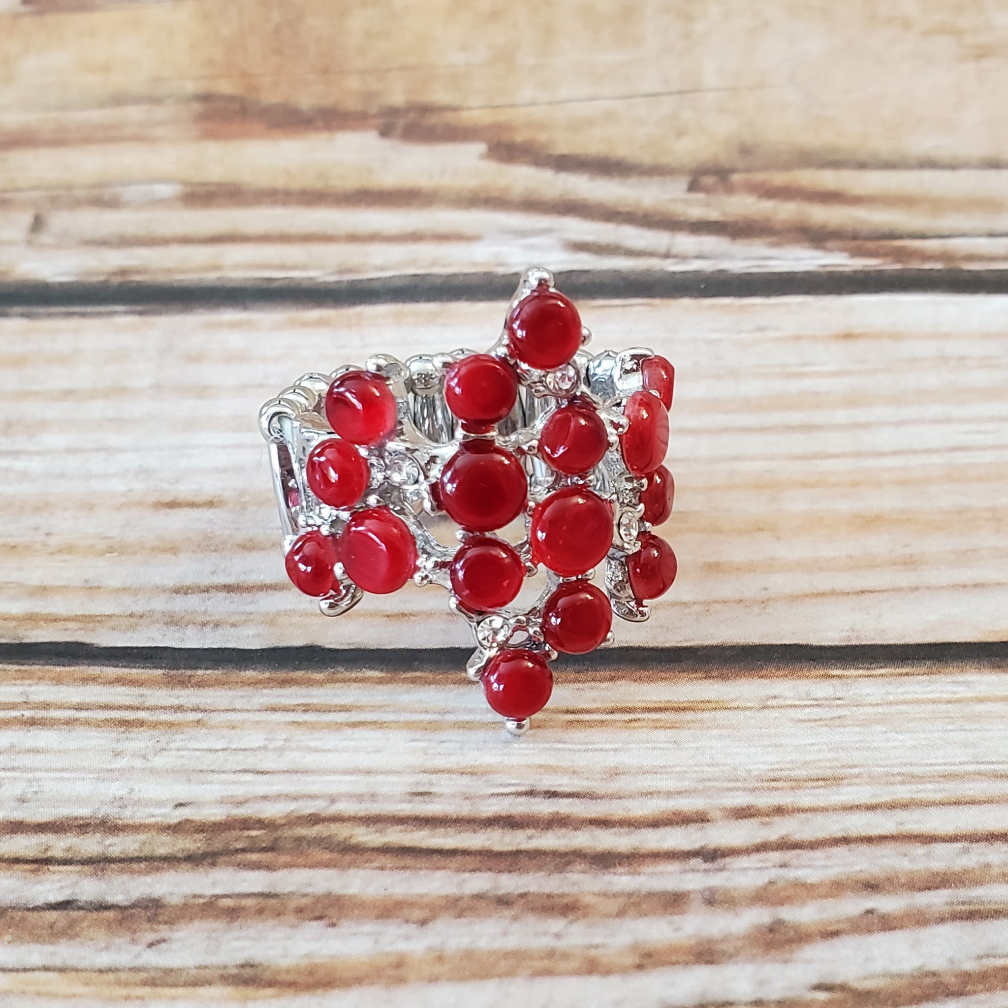 Featuring pronged silver fittings, a dreamy collection of dainty white rhinestones and bubbly red cat's eye stones scatter across the finger for an enchanting fashion. Features a stretchy band for a flexible fit.