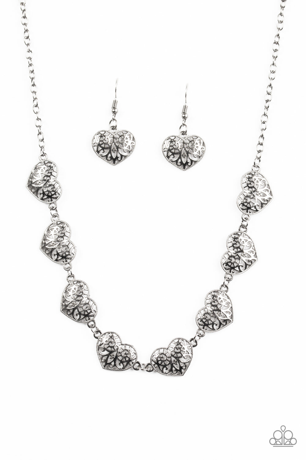 Featuring filigree filled centers, glistening gunmetal hearts connect below the collar for a romantic look. Features an adjustable clasp closure.