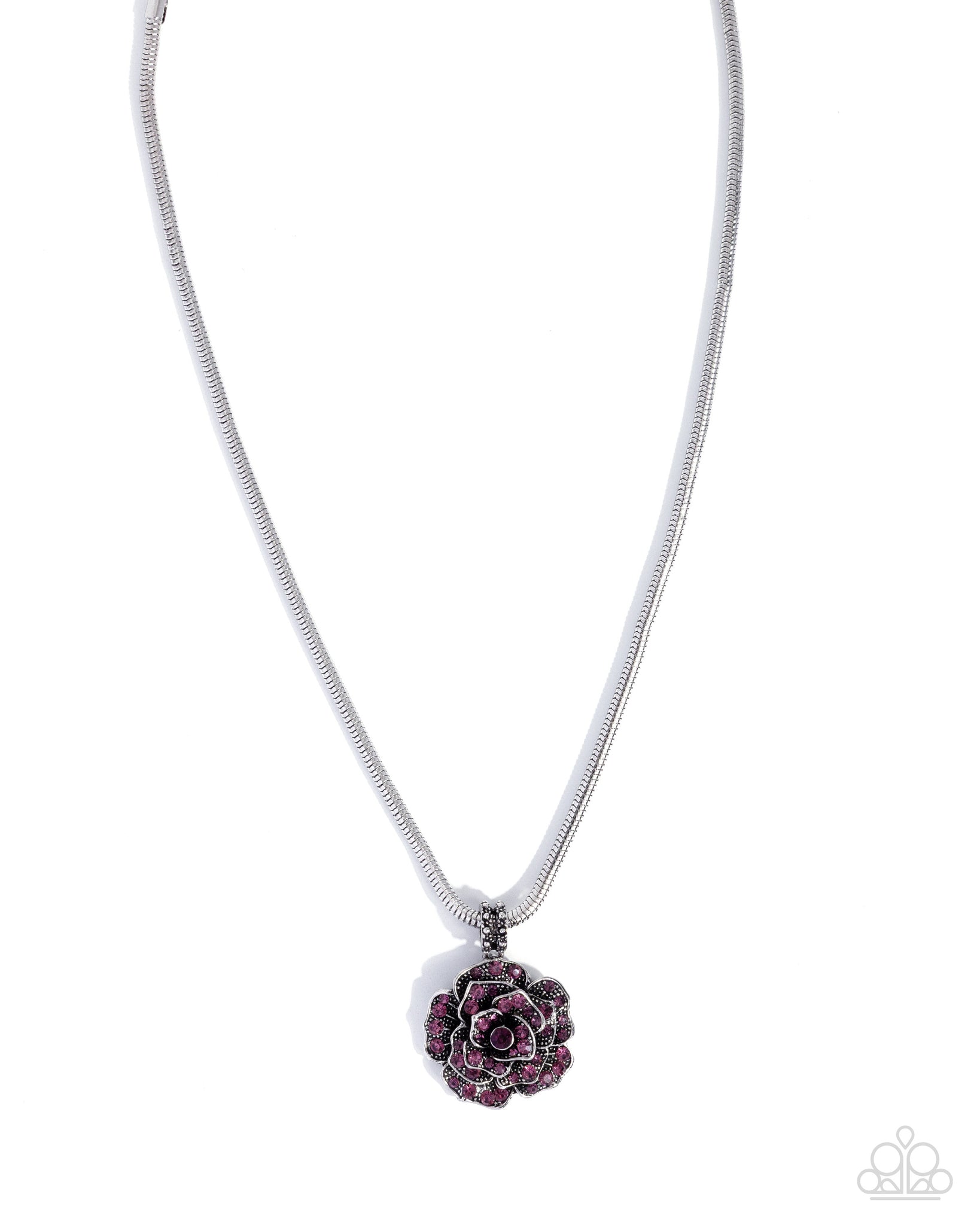 Gliding along a silver snake chain, a three-dimensional silver flower dotted with silver studs and amethyst and light amethyst rhinestones sways from a silver stud-embellished bail clasp for a whimsical flourish below the neckline. Features an adjustable clasp closure.