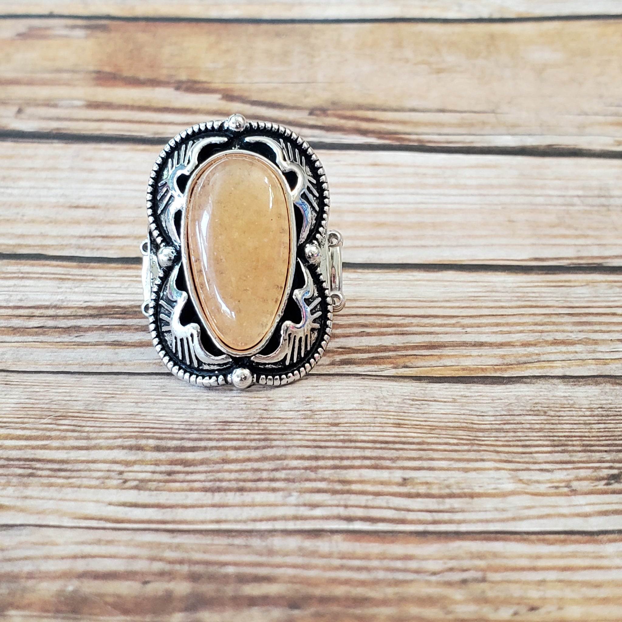 An oversized glassy orange stone teardrop is pressed into the center of a decoratively scalloped silver frame, creating an enchanting centerpiece atop the finger. Features a stretchy band for a flexible fit.