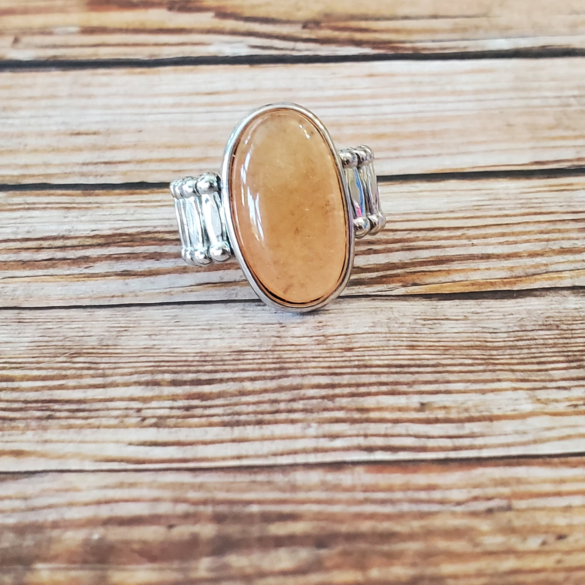 An oval orange stone is encased inside a sleek silver frame, creating a mystical centerpiece atop the finger. Features a stretchy band for a flexible fit. As the stone elements in this piece are natural, some color variation is normal.