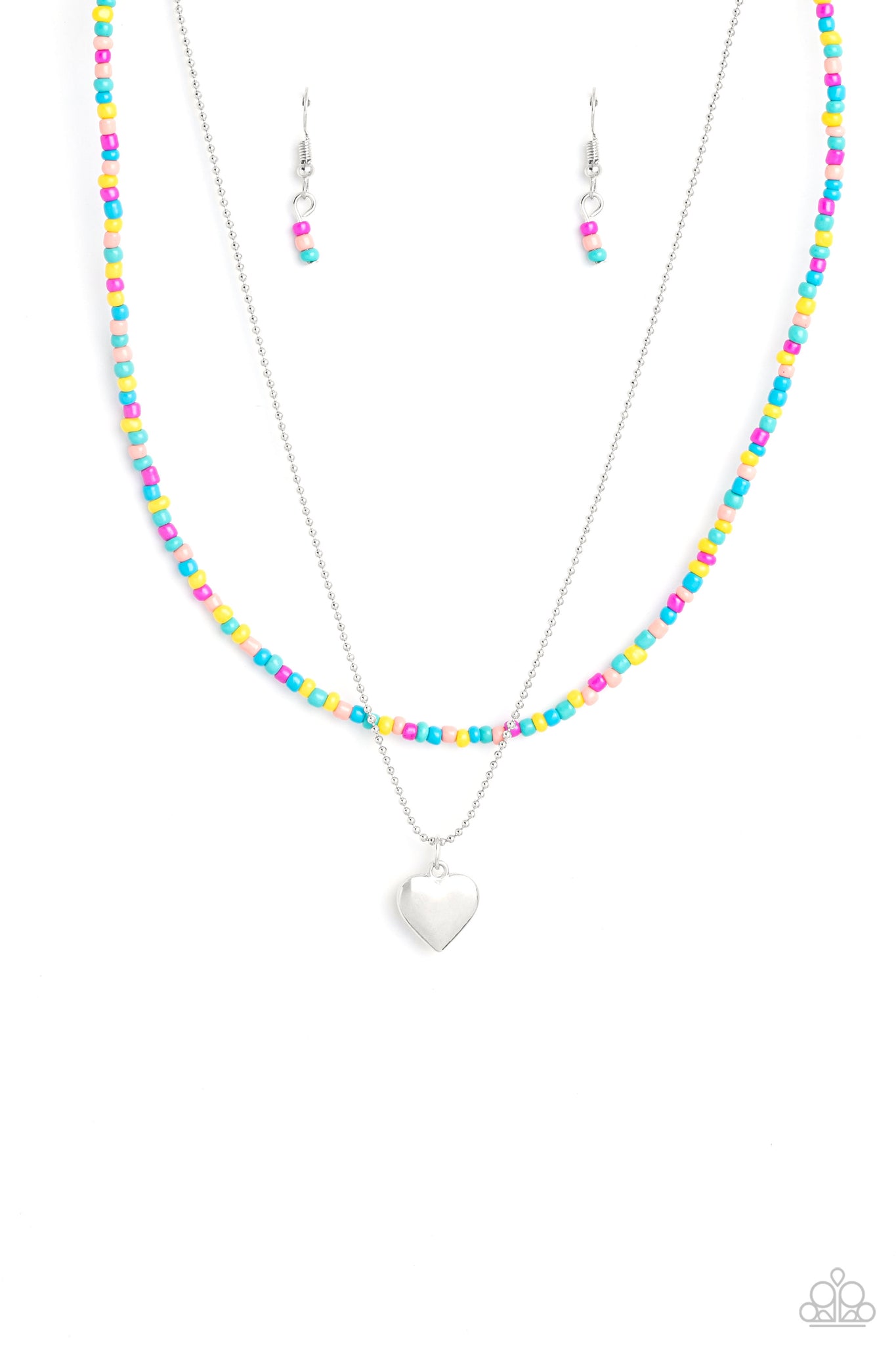 Multicolored seed beads are threaded along a wire, falling along the collar in a capricious pattern. A delicate silver ball chain featuring a dangling silver heart pendant, layers together with the colorful beads for a sassy and sweet combo. Features an adjustable clasp closure.