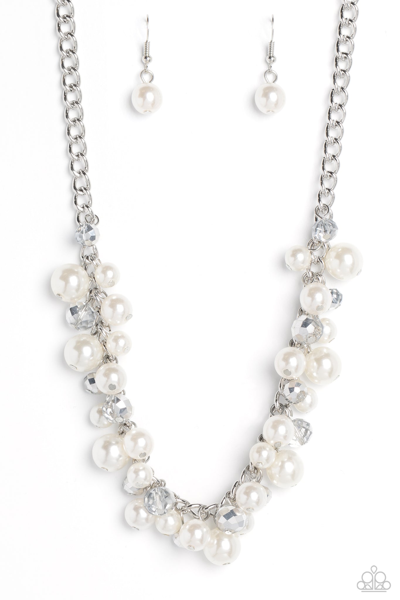 A faceted collection of glassy, silver crystal-like beads and classic white pearls in varying sizes flickers and flashes below the collar on a thick silver curb chain for a refined shimmer. Features an adjustable clasp closure.