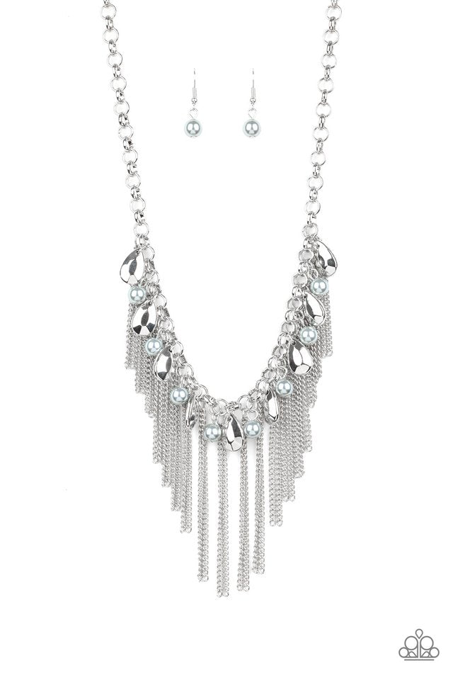 A collection of faceted silver teardrops and pearly silver beads drip from the bottom of a shiny silver chain. Pairs of shiny silver chains stream from the bottom of the chain, creating an intensely tapered fringe below the collar. Features an adjustable clasp closure.