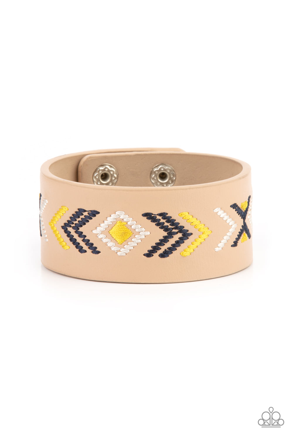 Yellow, blue, and white thread is stitched across the front of a brown leather band, creating a colorful tribal inspired pattern. Features an adjustable snap closure.