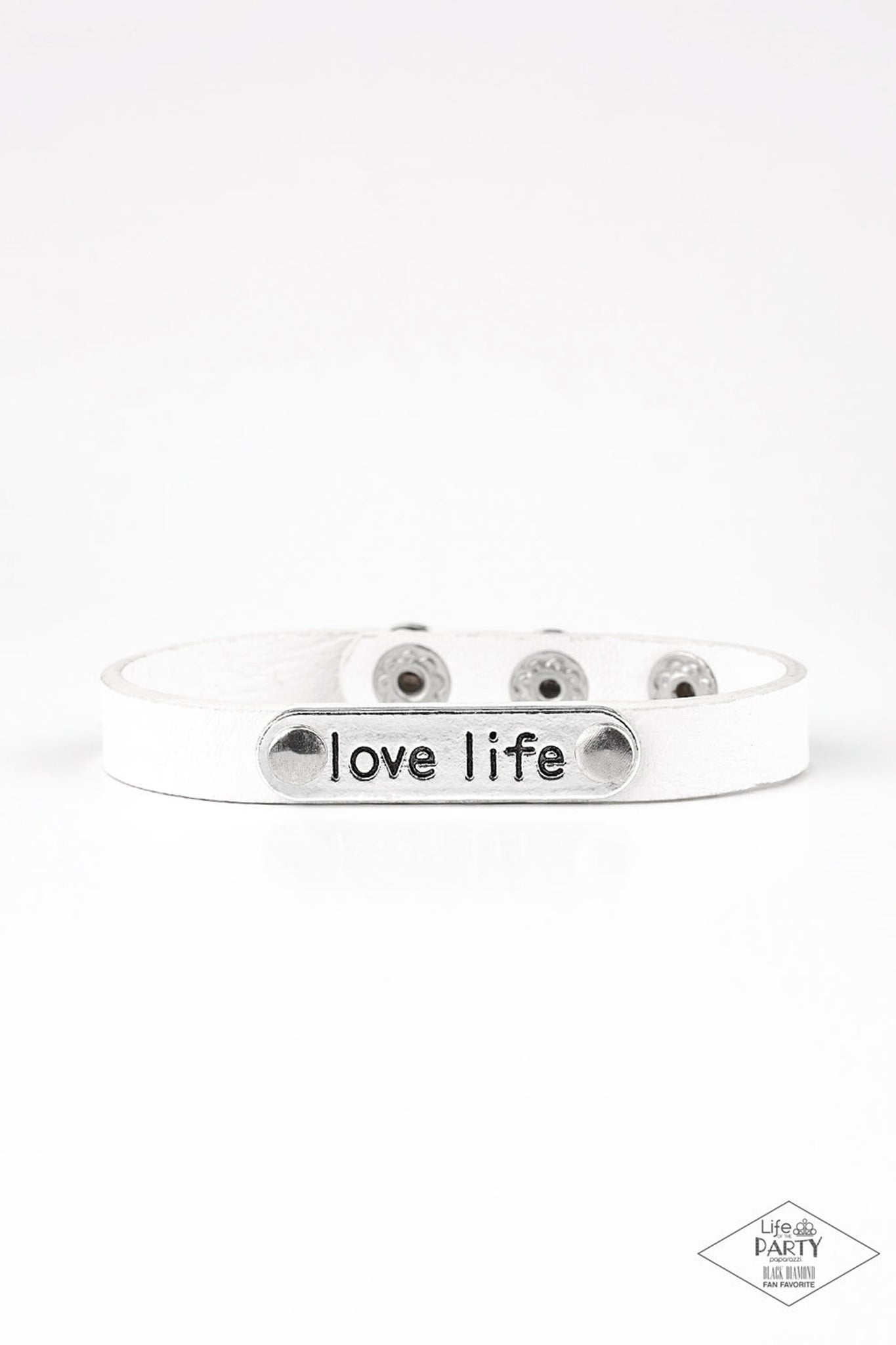 A silver plate engraved with the inspirational phrase “love life” is studded in place along a skinny strip of white leather. Brushed in a shiny finish, the dainty band wraps around the wrist in a simply seasonal style. Features an adjustable snap closure.