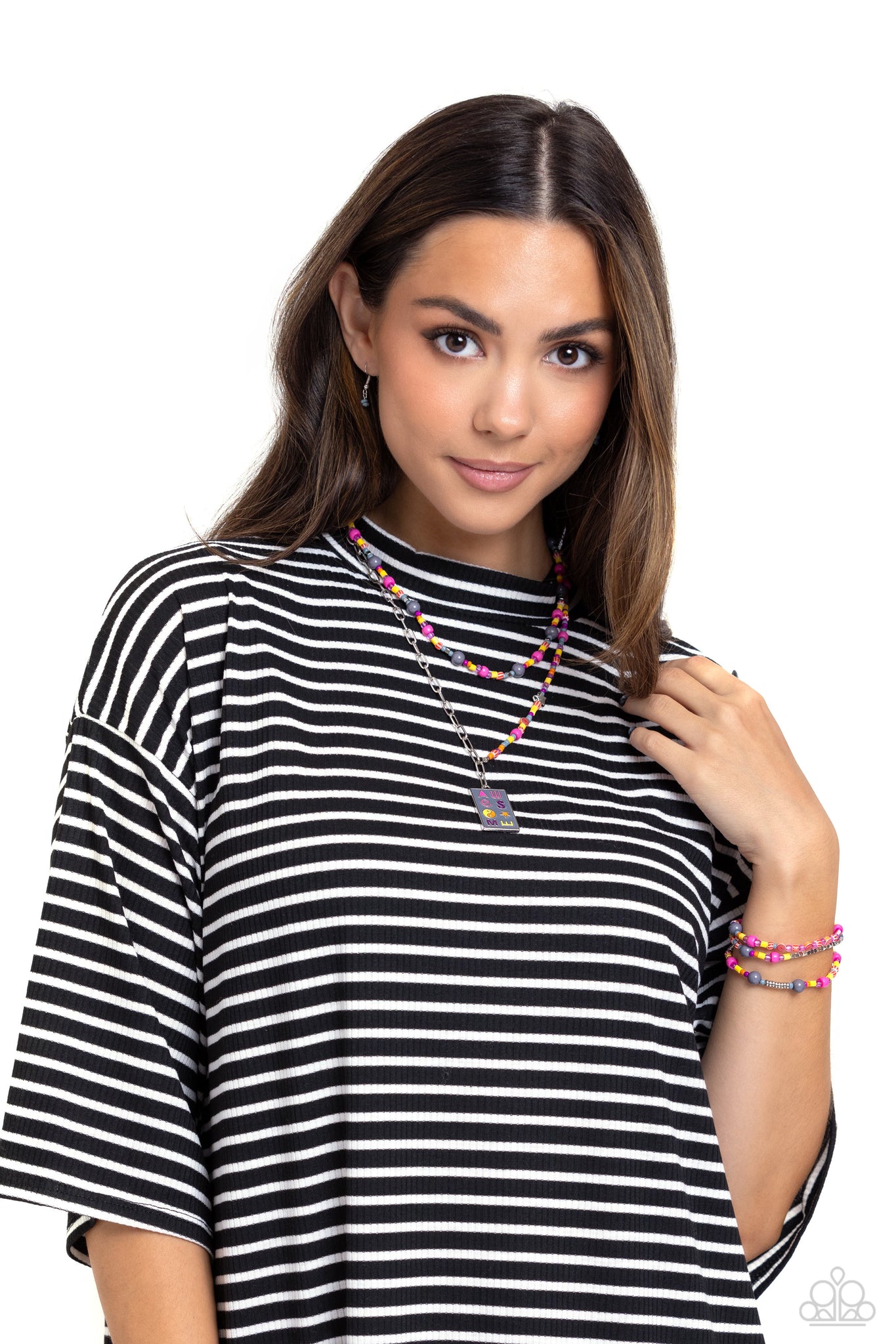 Featuring a mismatched finish, a collection of gray, orange, yellow, purple, and Rose Violet seed beads with various silver accents trickle along elastic stretchy bands for a trendy display.