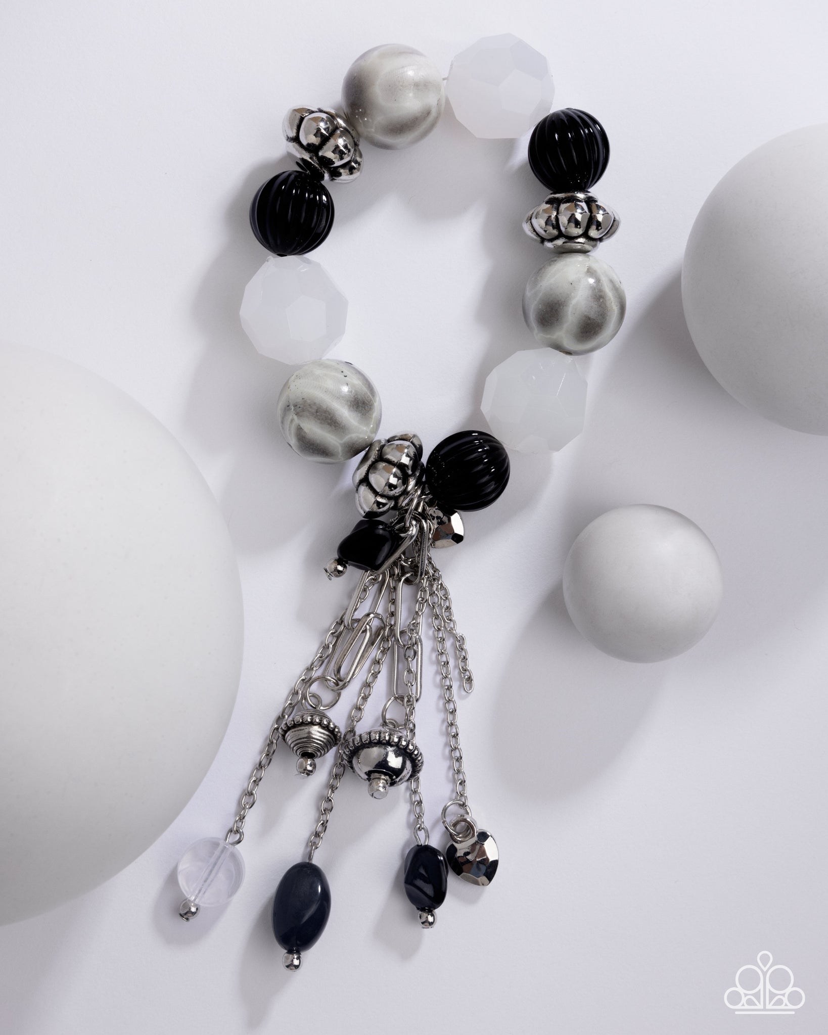 Dainty black beads nestled among beautiful silver and white pieces along a stretchy band. Dangling charms add a dramatic effect.
