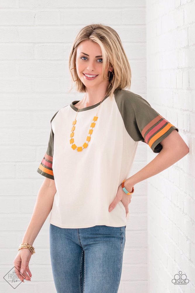 Metal rectangles painted in the spring Pantone® shades of Cerulean, Rust, Marigold, and Burnt Coral are threaded along stretchy bands, forming a gorgeous spectrum of color that wraps around the wrist.