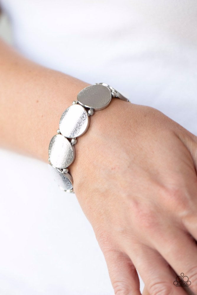 Infused with pairs of dainty silver beads, delicately hammered silver discs slide along a stretchy band around the wrist for a hint of industrial flavor.