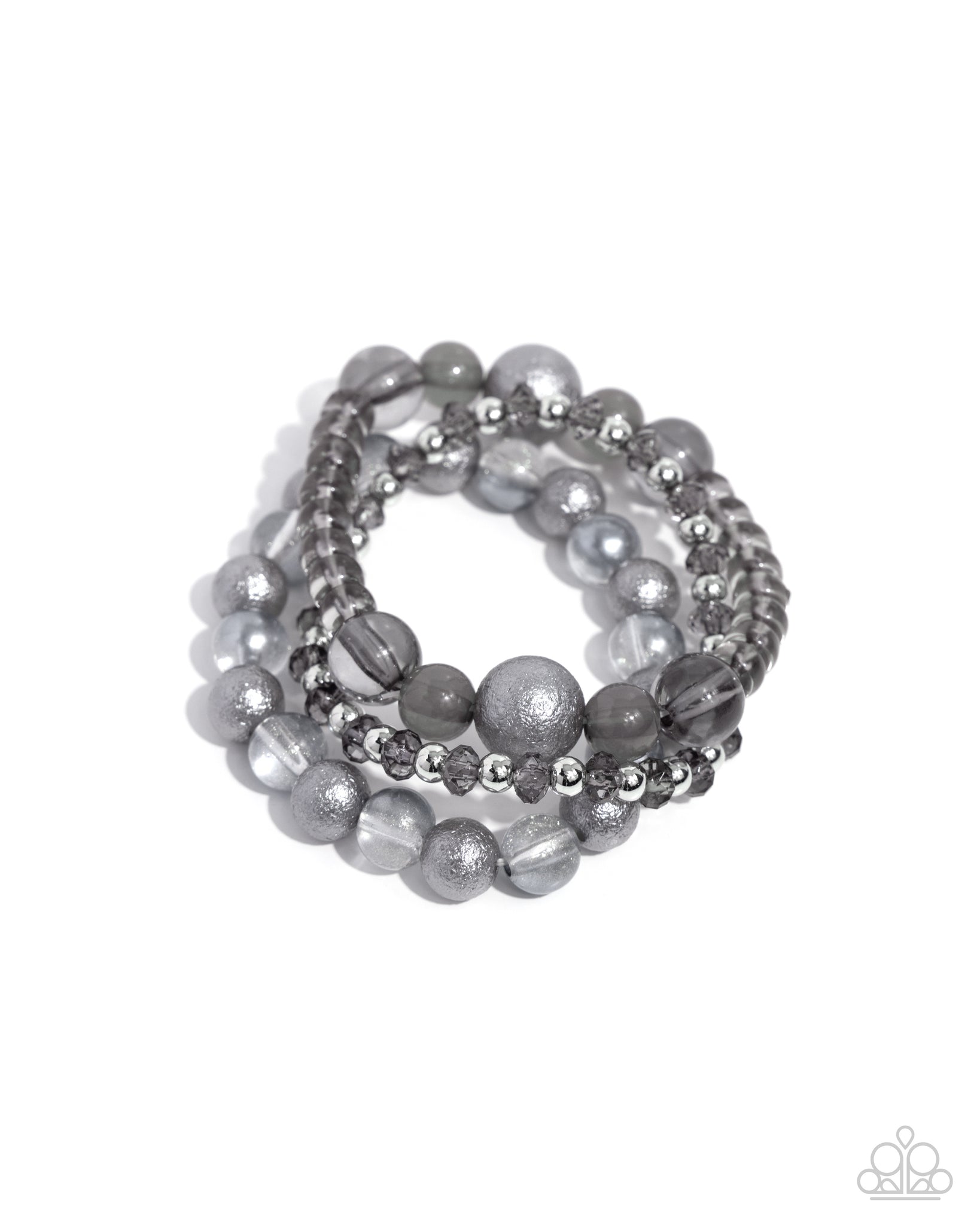 Quiet Shade milky, clear, and glittery beads in varying sizes and faceted details combine with sleek silver beads along elastic stretchy bands for a colorful stack.