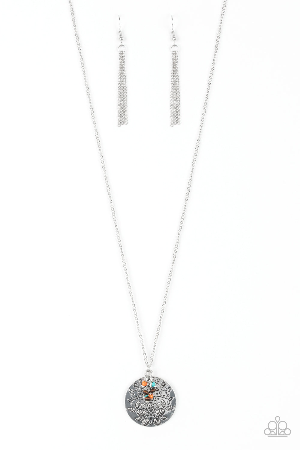 A floral embossed silver disc and dainty wooden and multicolored stone beads swing from the bottom of a lengthened silver chain for whimsical look. Features an adjustable clasp closure.