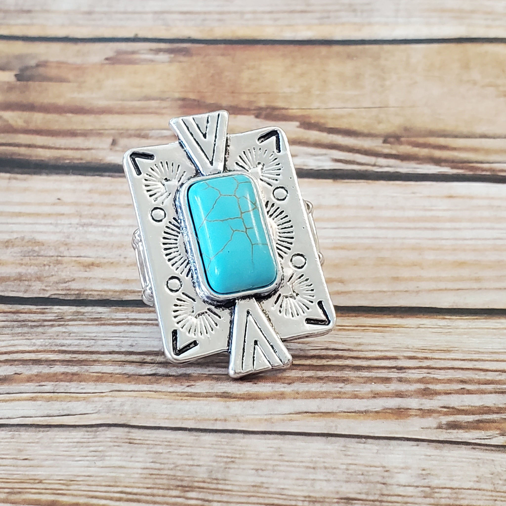 Chiseled into a tranquil rectangle, a refreshing turquoise stone is pressed into a bold silver frame radiating with tribal-inspired patterns for a seasonal look. Features a stretchy band for a flexible fit.