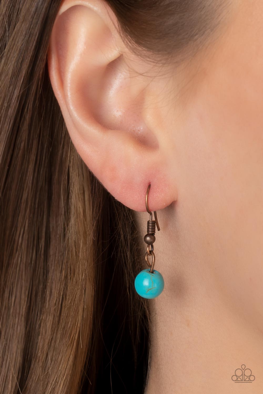 An oversized turquoise stone teardrop is pressed into the studded center of a hammered copper frame, resulting in a rustic pendant at the bottom of a lengthened copper chain. Features an adjustable clasp closure.