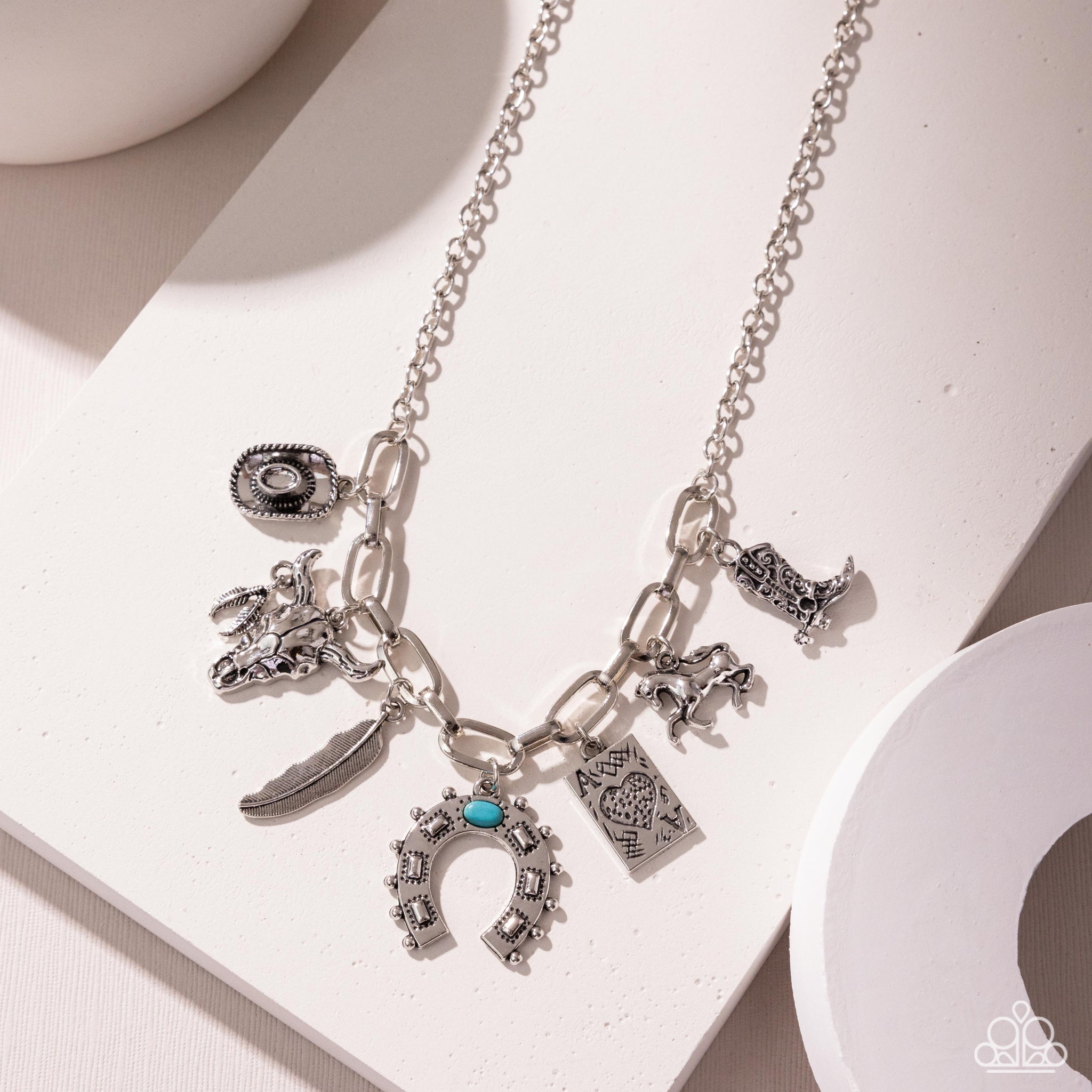 A glistening silver cable chain connects to a strand of silver paperclip chain below the neckline for a sleek sundry. A collection of Western-inspired silver charms, including a textured cowboy boot with a spur, a horse, an ace of hearts card, an upside-down textured horseshoe with a solitaire turquoise oval stone, a feather, a bull skull, smaller feathers, and a textured cowboy hat freely swing from the paperclip strand for a wild finish. Features an adjustable clasp closure. As the stone elements in this piece are natural, some color variation is normal.