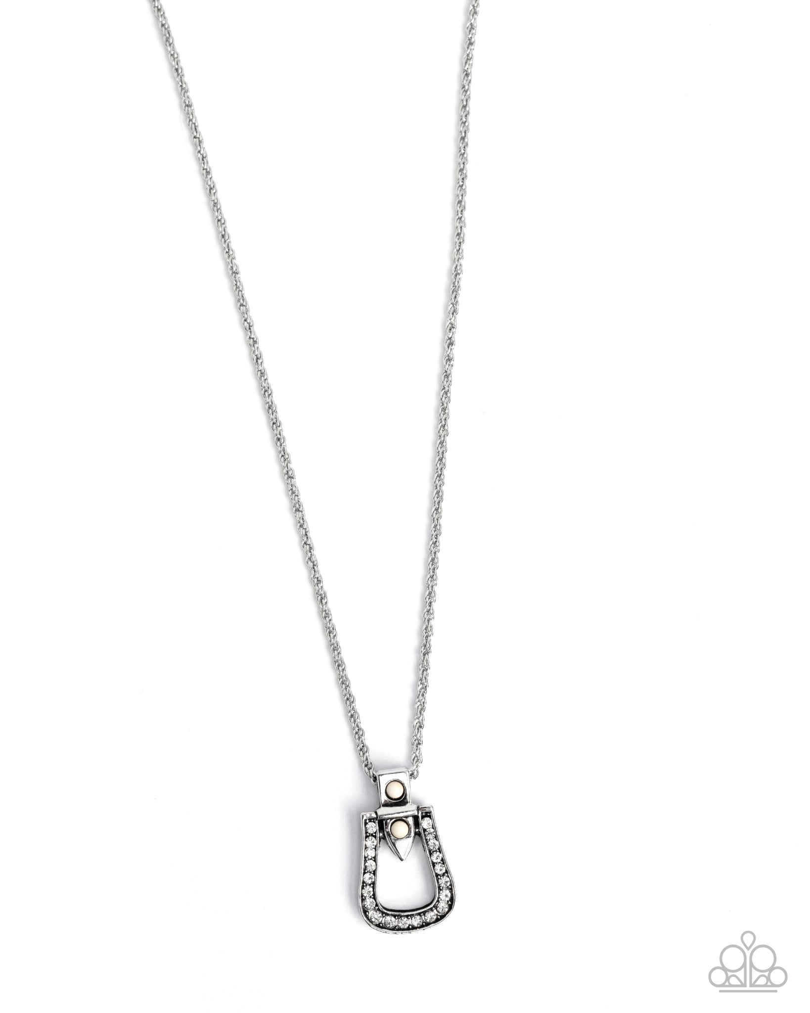 Gliding from a dainty silver rope chain, a silver stirrup-shaped pendant, lined with sparkling rhinestones and accented by dainty white stones, rests below the collar. The mix of shimmer and stone create a sleek and sophisticated look. Features an adjustable clasp closure.