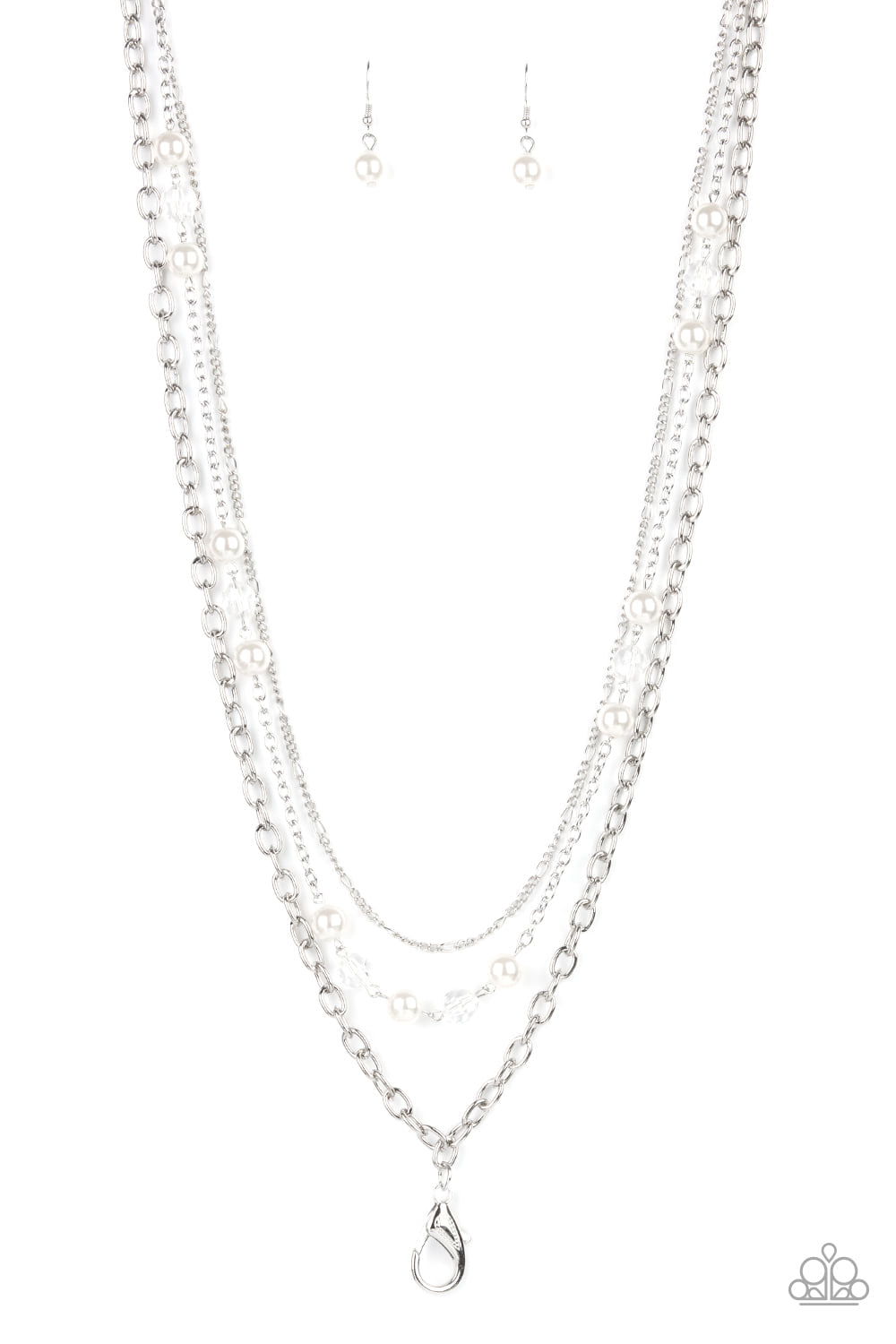 Dotted with sections of white pearls and glassy crystal-like accents, mismatched layers of shimmery silver chain layer across the chest for a refined flair. A lobster clasp hangs from the bottom of the design to allow a name badge or other item to be attached. Features an adjustable clasp closure.