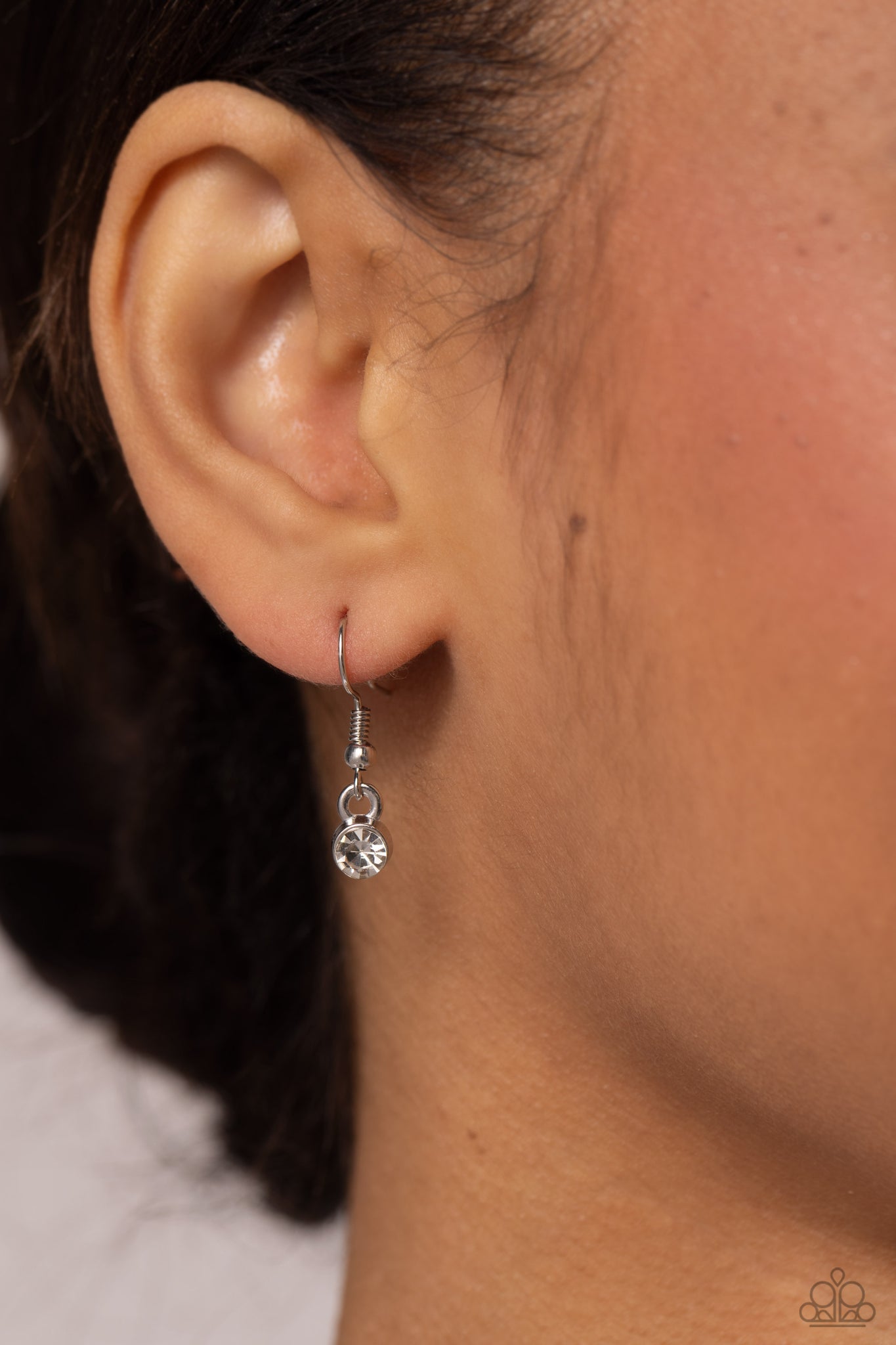 A sleek silver bar intersects with a classic silver hoop, creating an abstract pendant that slides along a strand of dainty silver box chain. A sparkling solitaire rhinestone sits at the bottom of the hoop, adding eye-catching glitz to the design. Features an adjustable clasp closure.