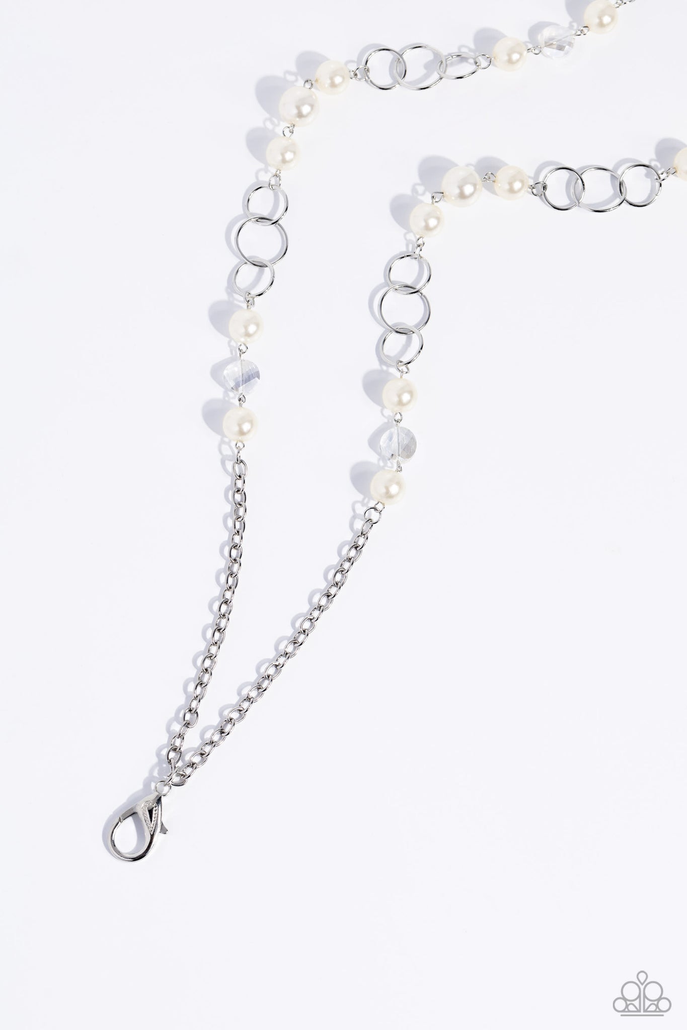 A classy collection of oversized white pearls, silver discs, and faceted chiseled clear beads trickle along an elongated shimmery silver chain for a refined look. A lobster clasp hangs from the bottom of the design to allow a name badge or other item to be attached. Features an adjustable clasp closure.
