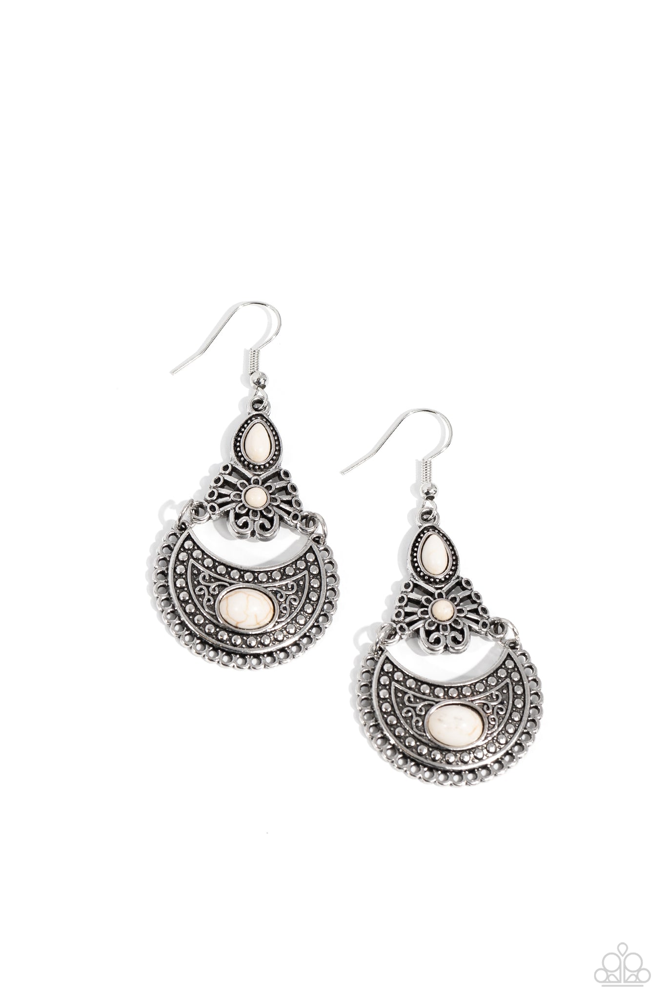 A dainty collection of teardrop, round and oval white stones adorns the front of a decorative lure. Filled with frilly filigree and rustic silver studs, the mismatched frames delicately link into an artisan inspired centerpiece. Earring attaches to a standard fishhook fitting.