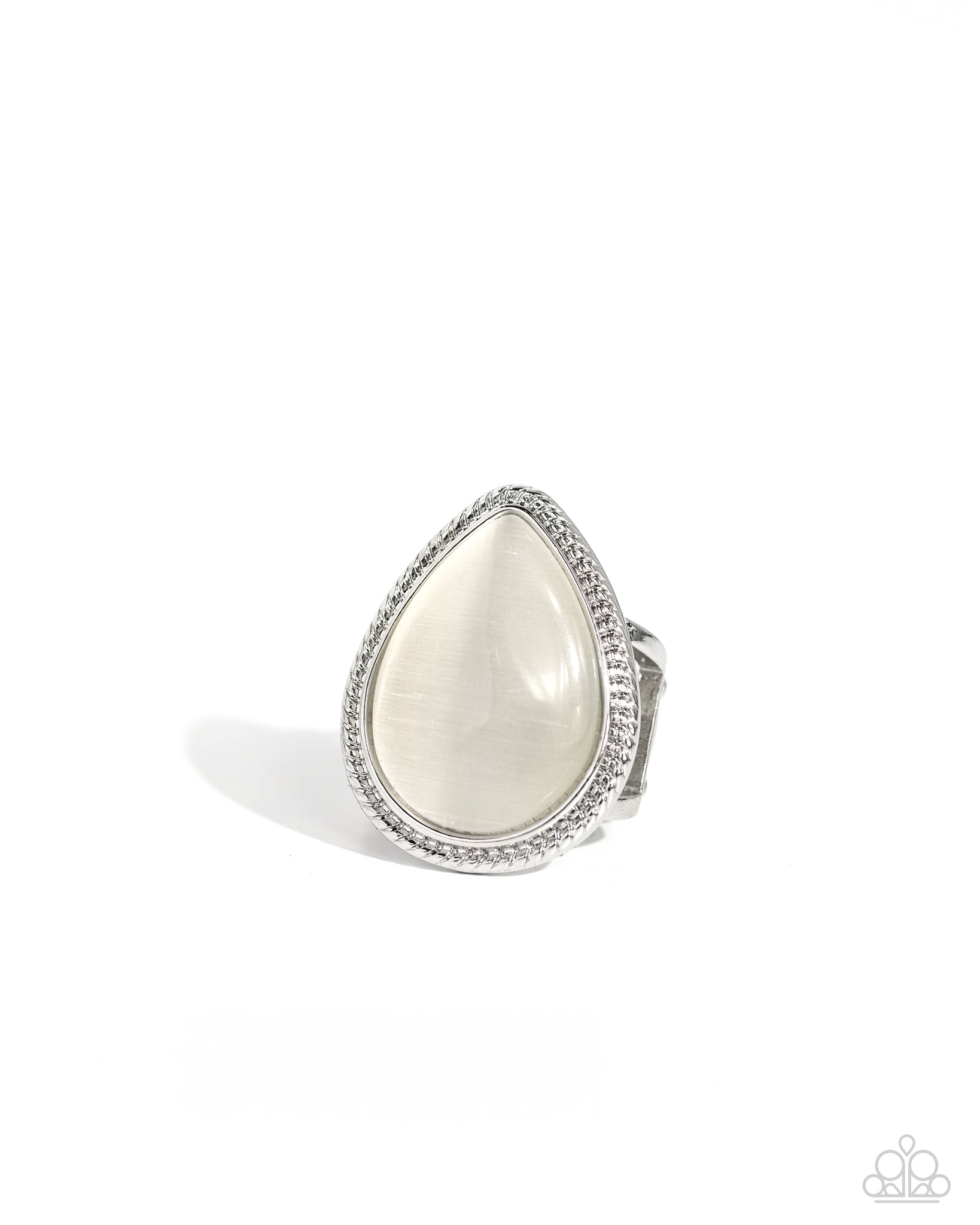 Encased in a layered silver frame of smooth rope-like texture, an oversized white cat's eye teardrop shines amongst airy bands of silver, creating a dramatic display of color atop the finger. Features a stretchy band for a flexible fit.