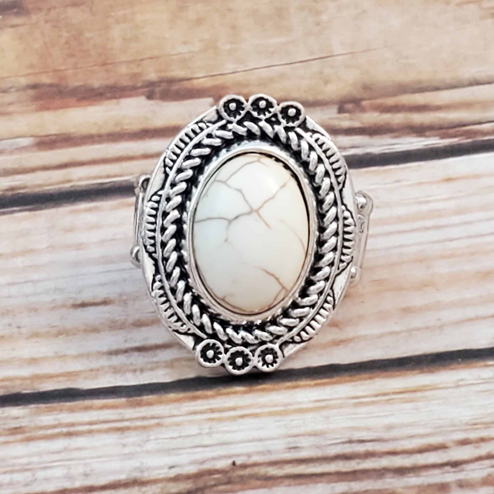 A refreshing white stone is pressed into an antiqued silver frame radiating with floral detail for a seasonal look. Features a stretchy band for a flexible fit.