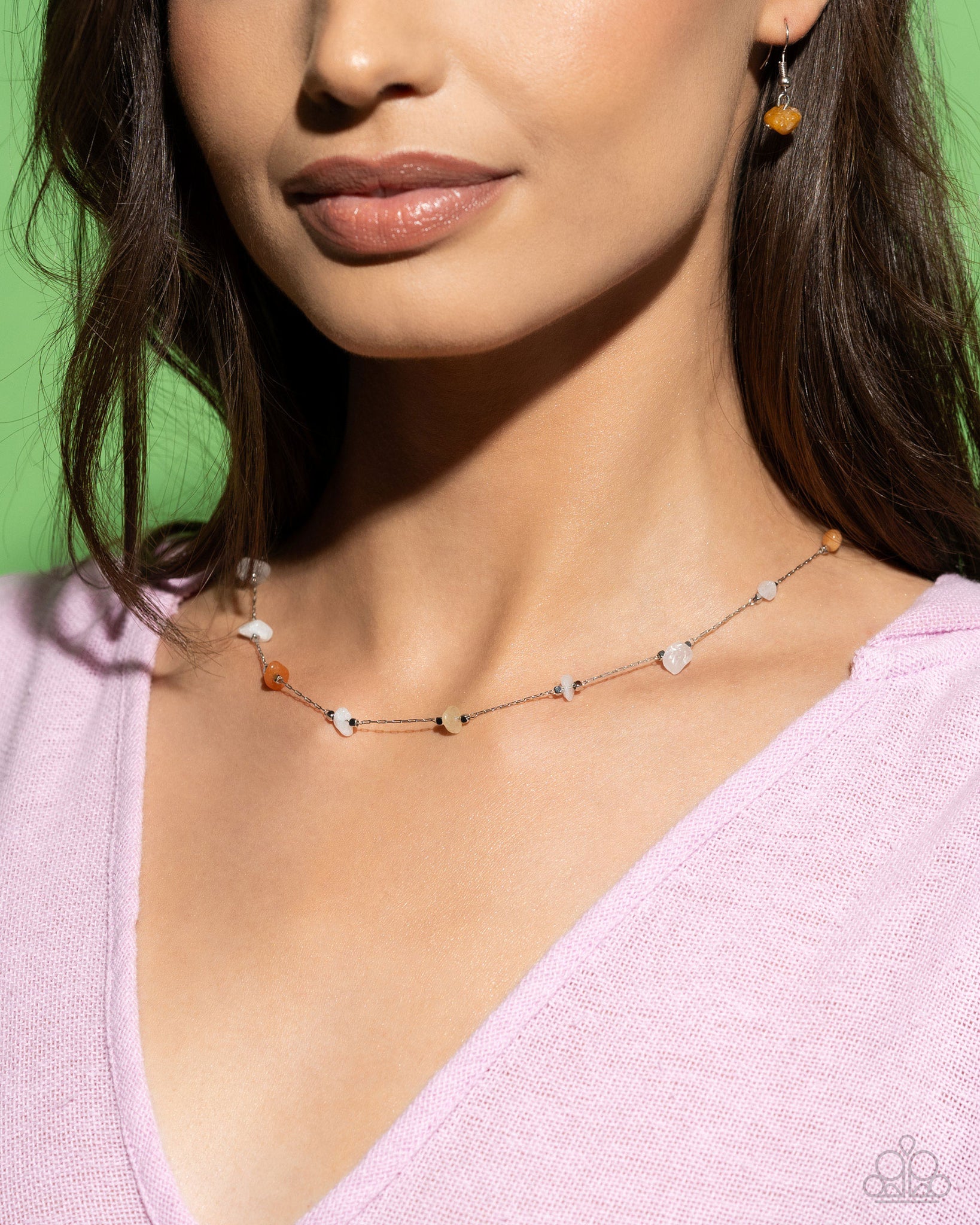 Infused along a silver chain, orange, yellow, pink, and white stones, bordered by silver beads, sporadically dot around the collar for a simple, stony statement. Features an adjustable clasp closure. As the stone elements in this piece are natural, some color variation is normal.