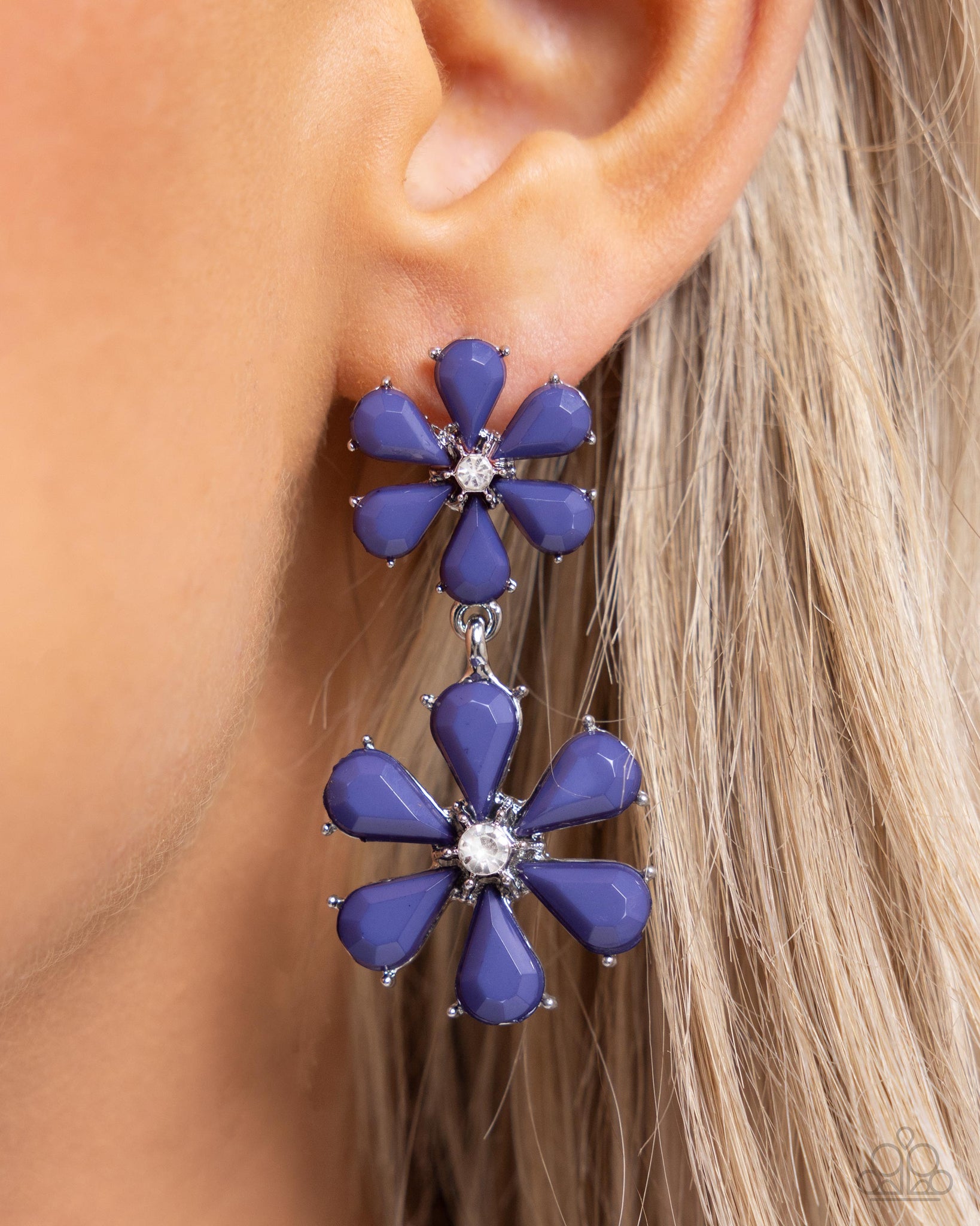 Dotted with dainty white rhinestone centers, a faceted assortment of Marlin teardrop beaded flowers link below the ear, gradually increasing in size for a playful pop of color. Earring attaches to a standard post fitting.