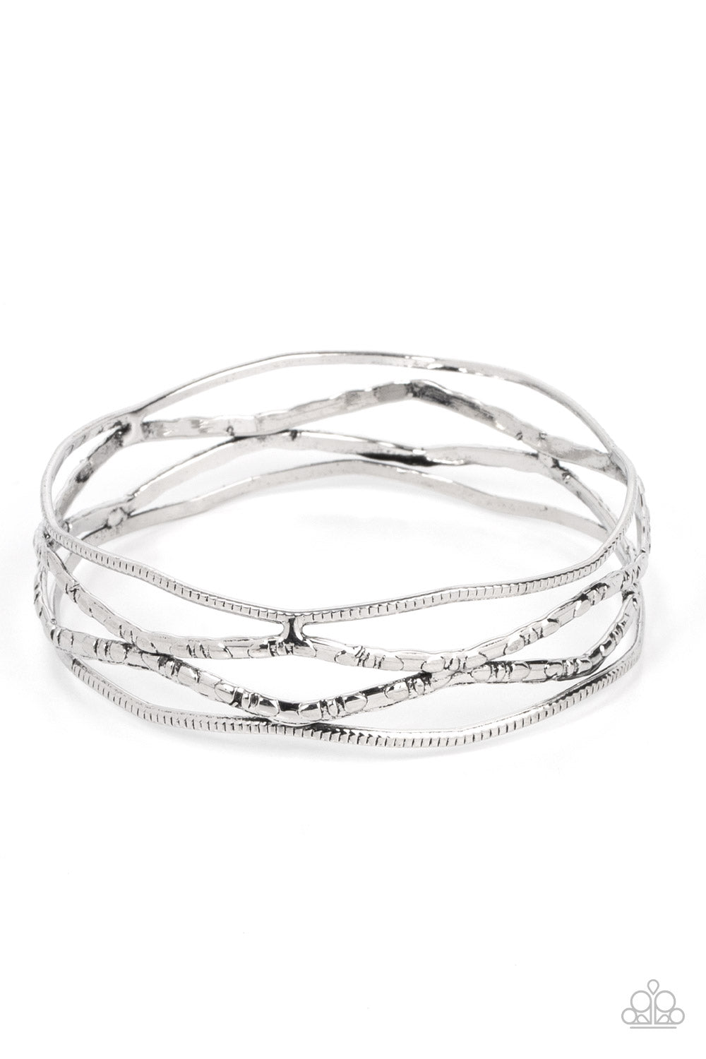 Textured and embossed in nature inspired patterns, rustic silver bars zigzag around the wrist as they stack into a wildly layered bangle.