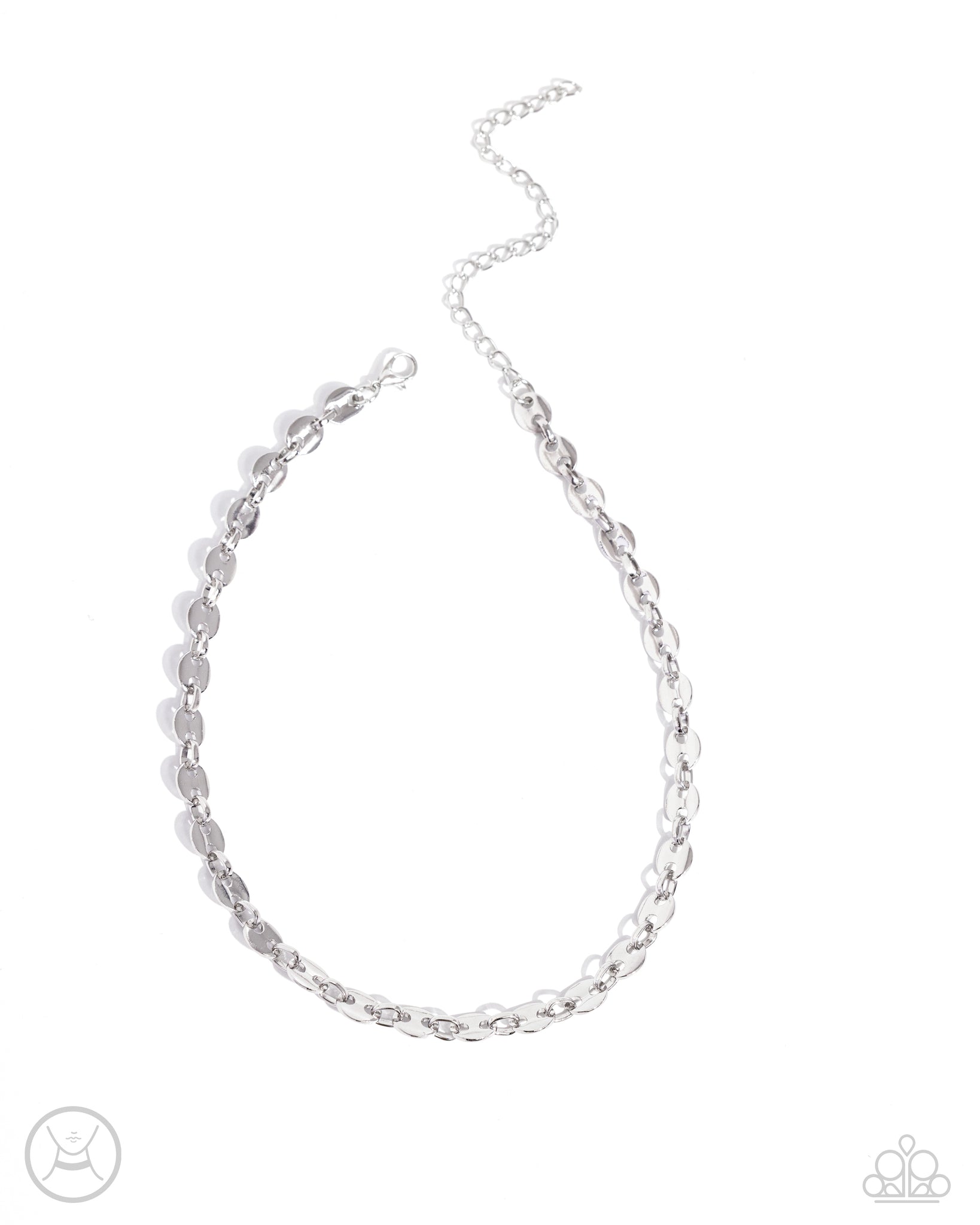 Resembling soda can tabs, an abstract silver chain interlocks around the collar for an industrial look. Features an adjustable clasp closure.