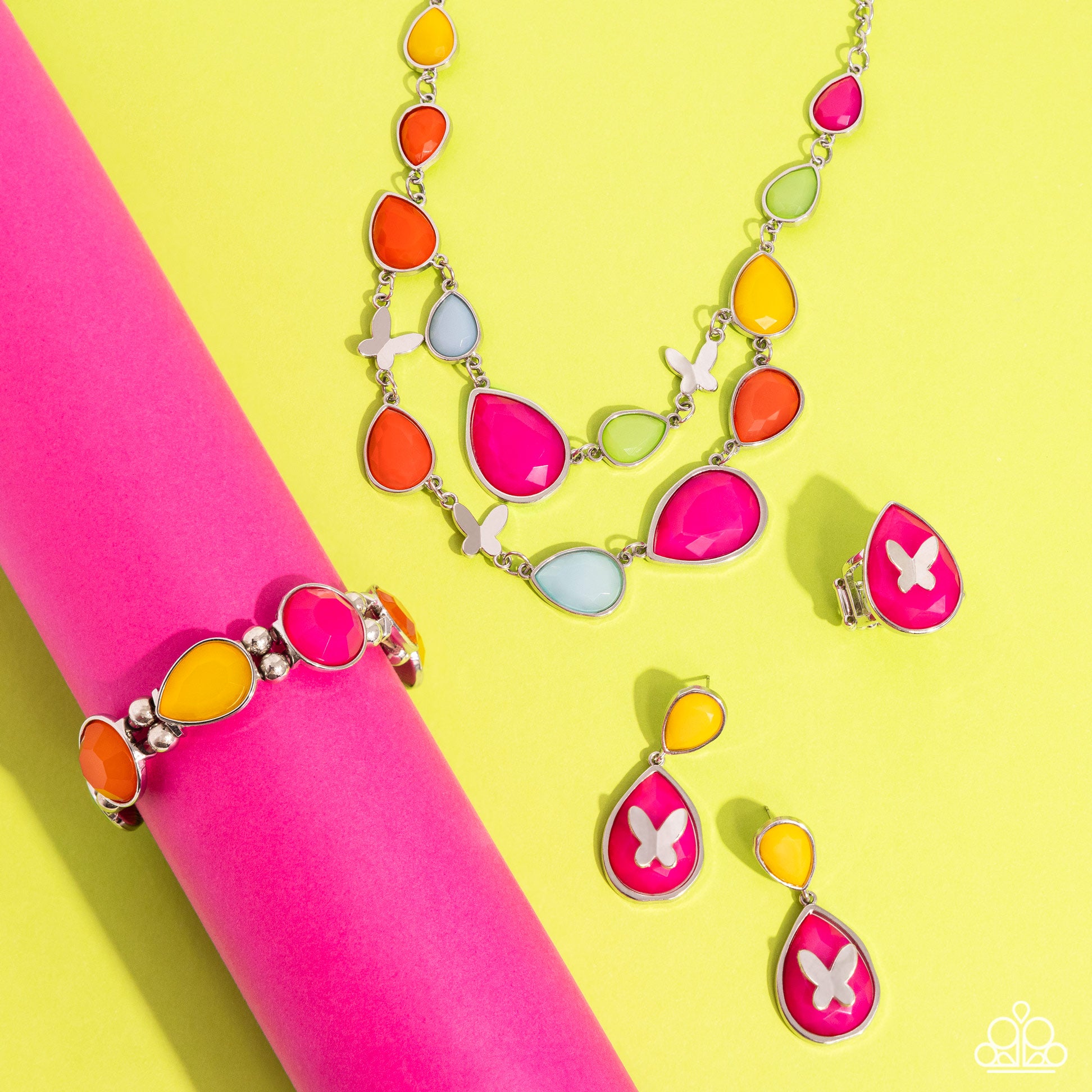 An exaggerated pink teardrop-shaped acrylic swings from the bottom of an upside-down yellow teardrop-shaped acrylic, creating a dramatically colorful lure. A dainty silver butterfly flutters atop the center of the pink acrylic for a whimsical finish. Earring attaches to a standard post fitting.
