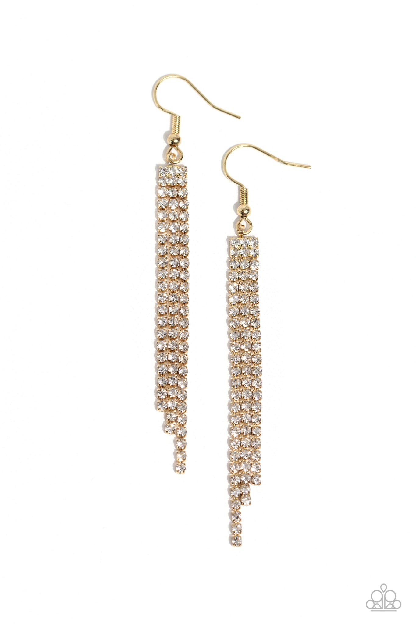 Encased in glistening gold fittings, glittery strands of glassy white rhinestones drip into a slanted tassel display for a timeless look. Earring attaches to a standard fishhook fitting.