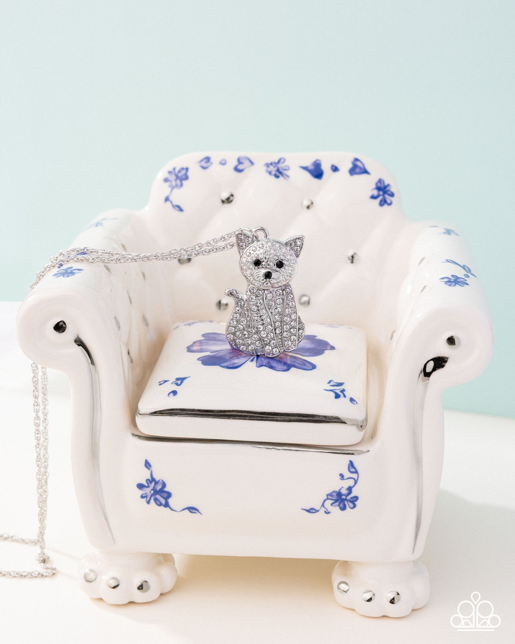 A delicate silver chain showcases a dazzling cat pendant. Encrusted with glittering rhinestones, the cat charm is given a whimsical yet sophisticated look. Its black rhinestone eyes and nose add an adorable contrast to the design, making it a charming accessory for any cat lover. Features an adjustable clasp closure.