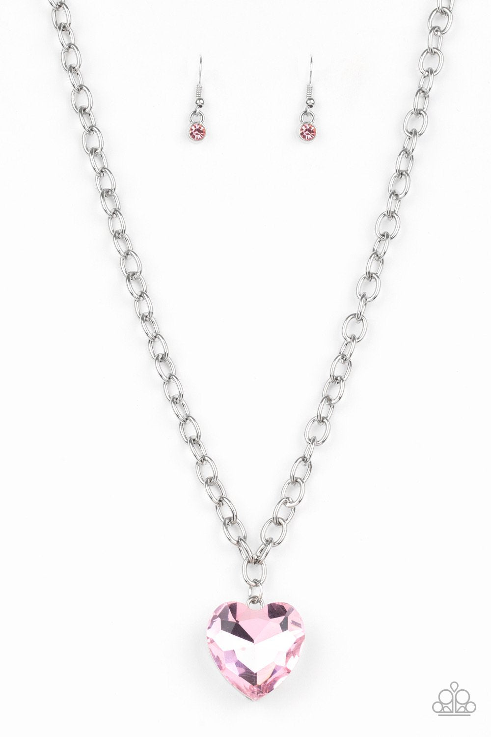 Set atop a sleek silver fitting, a glittery pink heart-shaped gem swings from the bottom of a classic silver chain below the collar for a whimsical look. Features an adjustable clasp closure.
