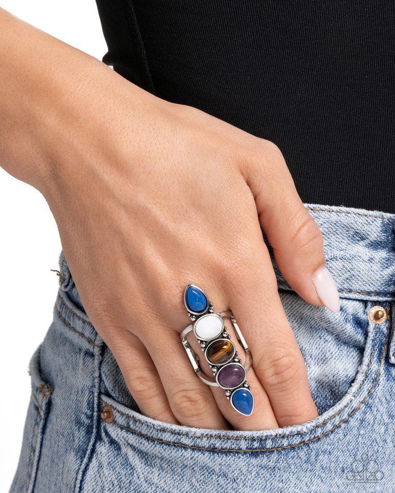 Featured inside an airy oval, imperfect lapis, amethyst, and tiger's eye stones and a round white shell in varying shapes dramatically stack atop the finger for an ethereally earthy look. Features a stretchy band for a flexible fit. As the stone elements in this piece are natural, some color variation is normal.