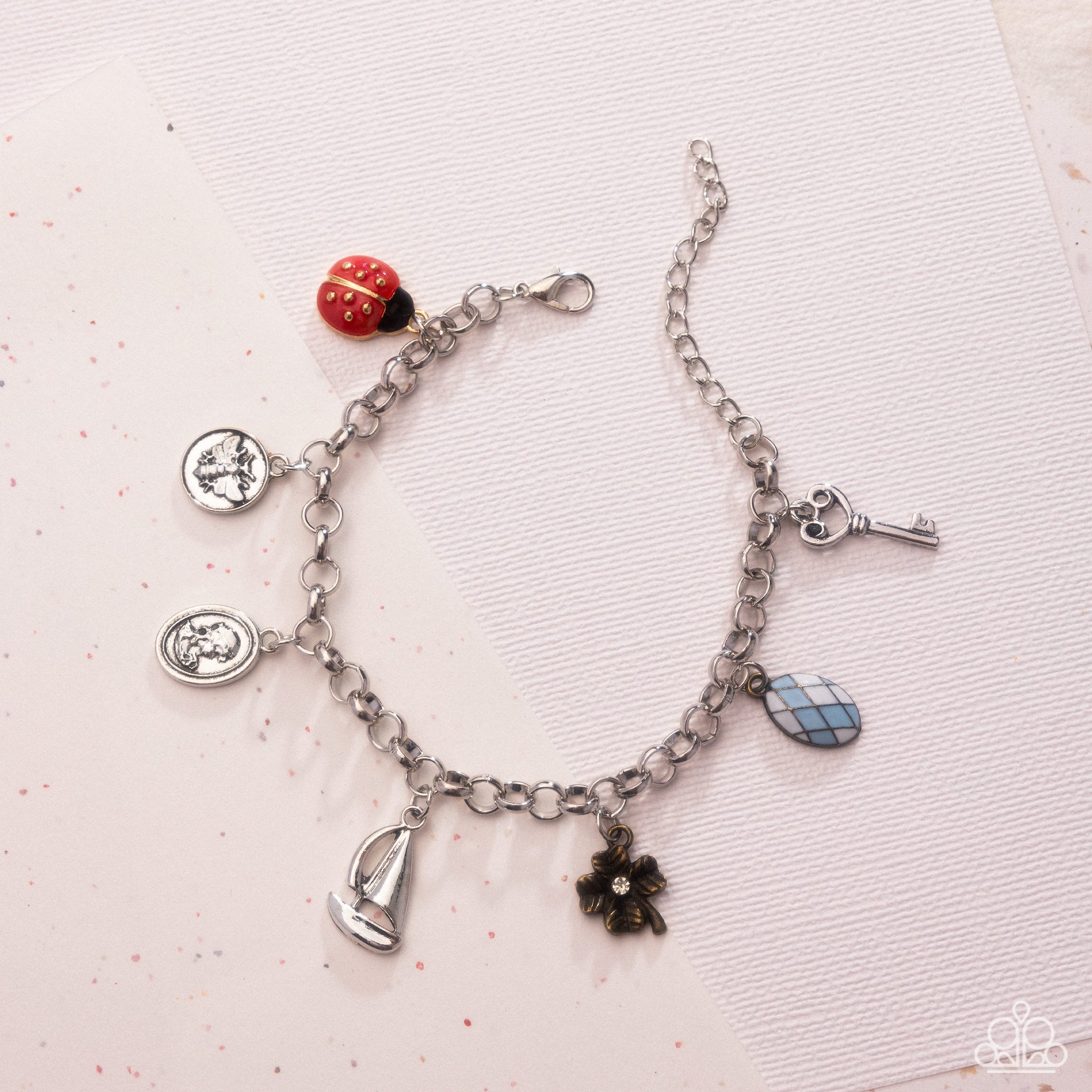 Swaying along a glistening silver cable chain, a collection of whimsical and vintage charms including a silver key, a silver bee pendant, an oval silver cameo pendant, a textured brass flower with a white rhinestone center, a silver sailboat, a pearlized-painted Limpet Shell and white egg, and a transparent red-painted ladybug with gold spots creates an eye-catching display along the wrist. Features an adjustable clasp closure.