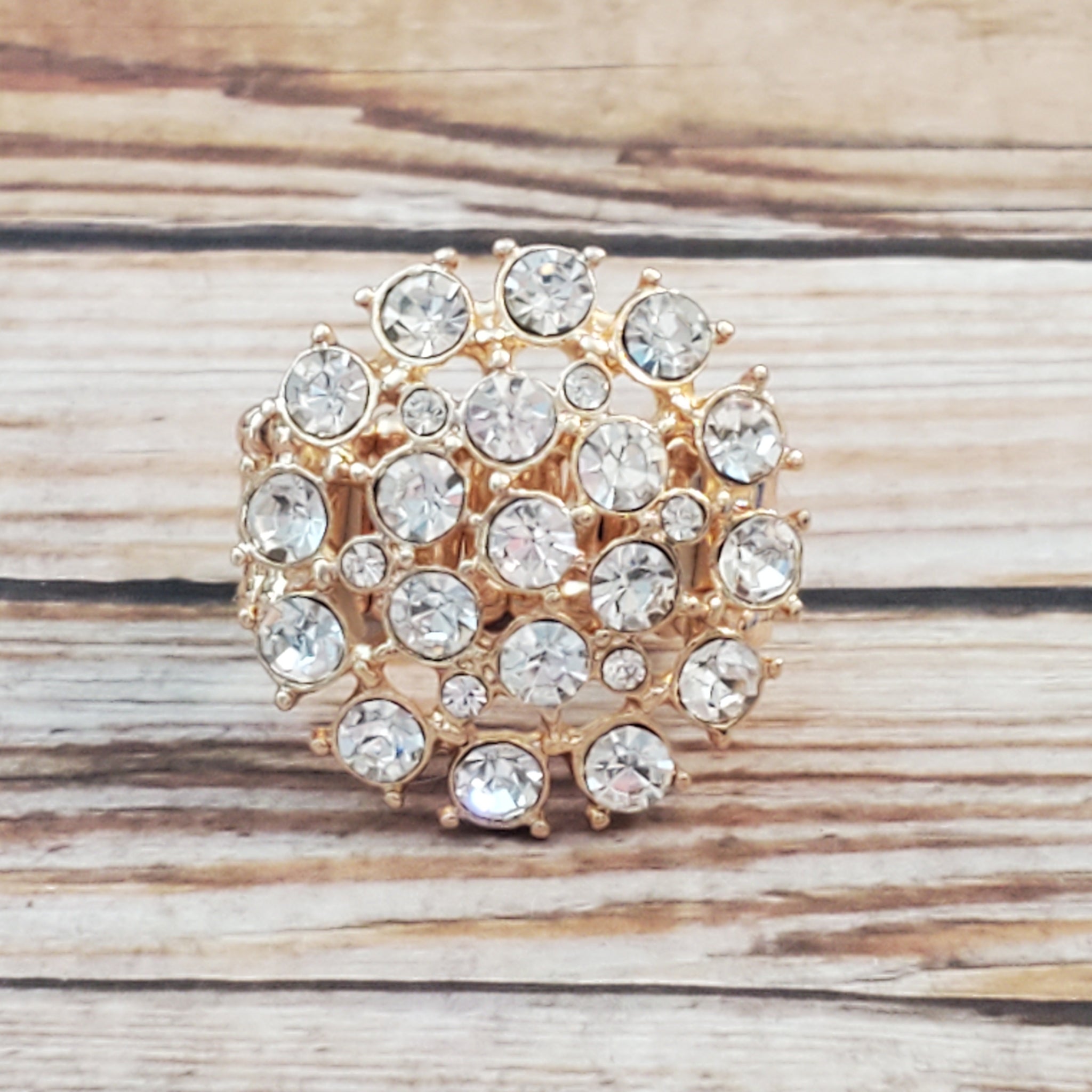 Featuring pronged gold fittings, an explosion of glassy white rhinestones sparkles atop the finger for a statement-making fashion. Features a stretchy band for a flexible fit.